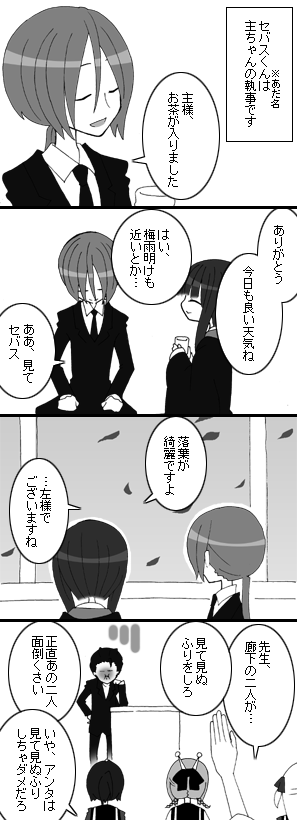 出席番号4番 尾伽 羊(おとぎ ひつじ) 主の執事。執事というだけで主やクラスからはセバス(orセバスチャン)と呼ばれている。 いつでもどこでも主に最高の環境を提供するのが務めらしい。 余談だが戦闘能力は幸に匹敵する。