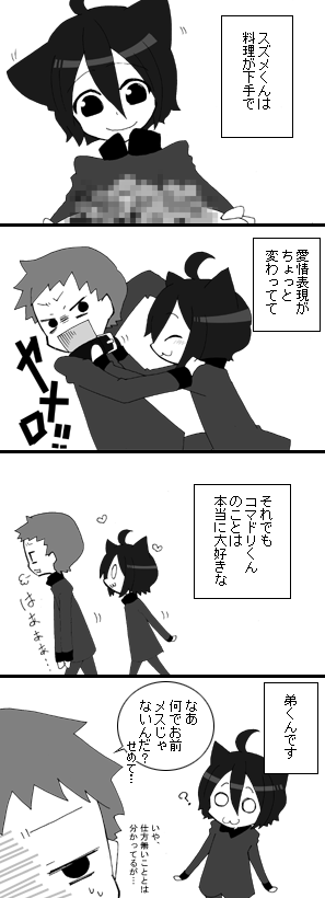 出席番号14番 毒島 すずめ(ぶすじま -) まったく似ても似つかないが、コマドリの双子の弟。 コマドリのことが大好きで、いつも傍にいる。あまり話さない。 見ての通り、本当は猫。