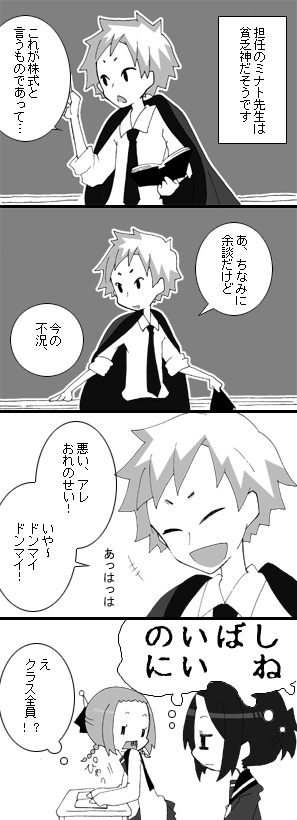 担任 落合 ミナト(おちあい -) 2年×組の担任。通称ミナト先生。 非常にポジティブな貧乏神。 貧乏だけで飽き足らず、人類の不幸を楽しんでる。
