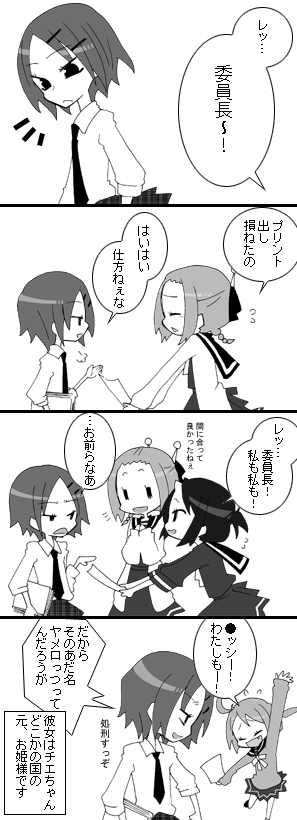 出席番号16番 舞姫 チエ(まえひめ ちえ) 2年×組の委員長。 身内には優しいが自分に逆らう者には容赦ない女王様性格。 だが、元どこかの国のお姫様。
