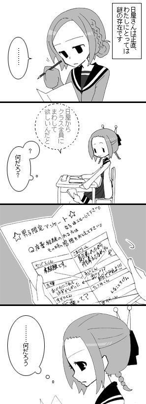 出席番号8番 日屋 あかり(にちや -) 漫研部所属の謎の多い女の子。結構多弁。 興味を示す方向がおかしい。 ゲーマーかつ立体マニアかつアニメ好きで腐女子。